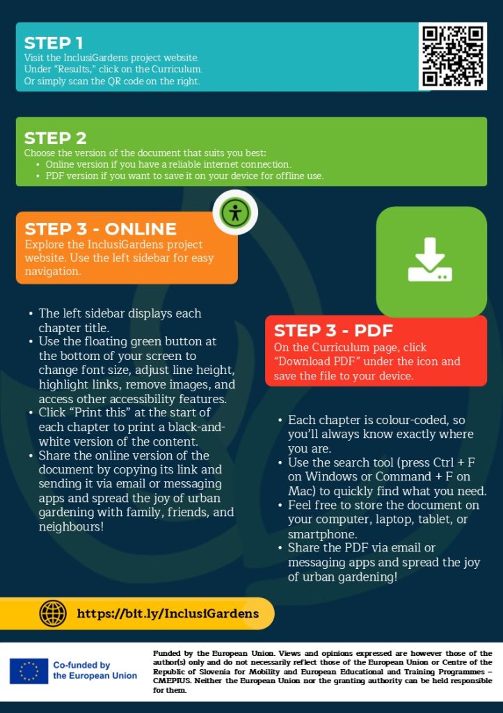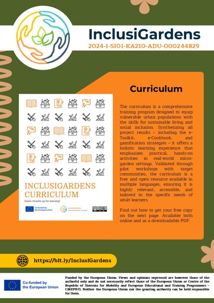 Kurikulum je sveobuhvatan program osposobljavanja osmišljen za osnaživanje ranjivih urbanih skupina vještinama potrebnim za održiv način života i društvenu uključenost. Objedinjavanjem svih rezultata projekta – uključujući e-Priručnik, e-Kuharicu i strategije igrifikacije – pruža cjelovito iskustvo učenja koje naglašava praktičan rad u stvarnim okruženjima mikrovrtova. Validiran kroz pilot-radionice s ciljnim zajednicama, ovaj je kurikulum besplatan i otvoren obrazovni resurs dostupan na više jezika, čime se osigurava njegova visoka relevantnost, pristupačnost i prilagođenost specifičnim potrebama odraslih polaznika.