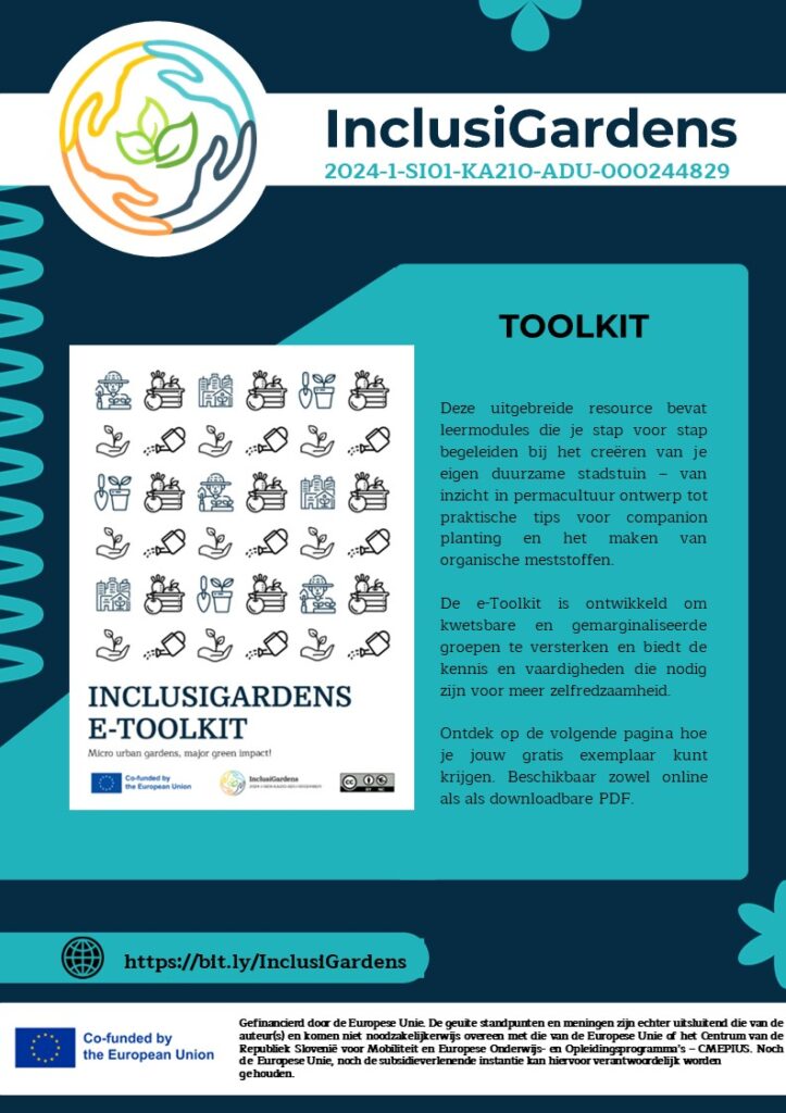 Ontdek hoe makkelijk en lonend duurzaam stedelijk tuinieren kan zijn met de InclusiGardens e-Toolkit! Deze uitgebreide bron is ontworpen om micro-tuinieren voor iedereen toegankelijk te maken en biedt stapsgewijze begeleiding en praktische ideeën voor het creëren en onderhouden van bloeiende groene ruimtes. Of je nu een zonnige vensterbank, een klein balkon of toegang tot een gemeenschappelijk perceel hebt, de e-Toolkit biedt de kennis en inspiratie om je eigen voedsel te verbouwen en in contact te komen met anderen door milieuvriendelijke tuinpraktijken.