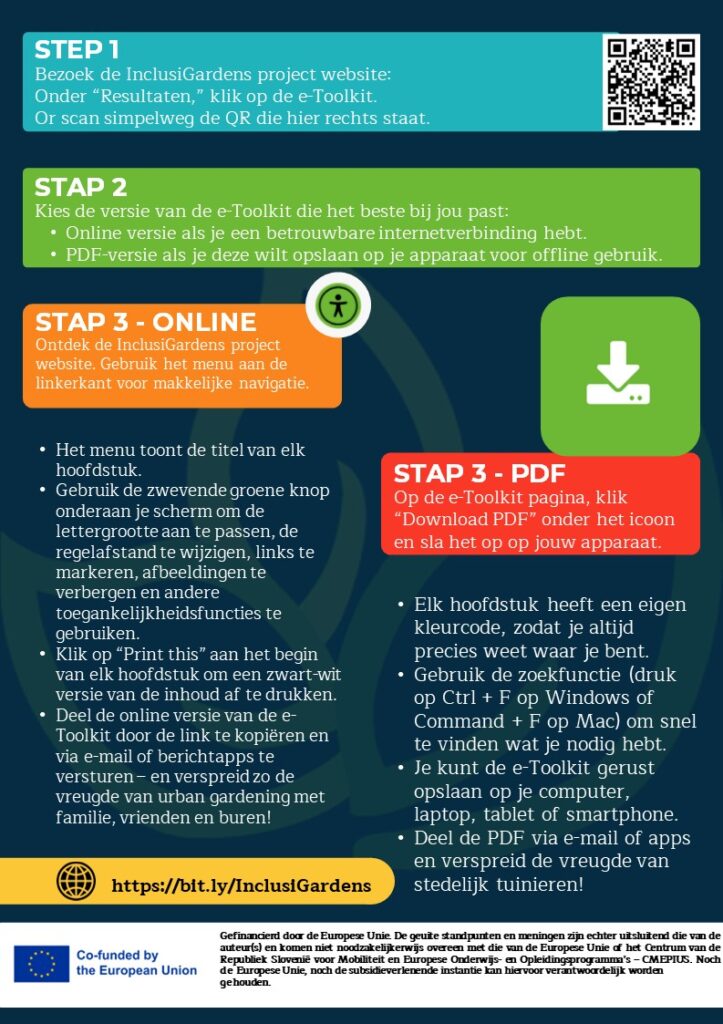 De e-Toolkit is een uitgebreide bron die is ontworpen om stedelijk micro-tuinieren voor iedereen toegankelijk te maken. Met stapsgewijze handleidingen, praktische tips en multimedia-inhoud voorziet het gebruikers van de kennis en vaardigheden om hun eigen duurzame stadstuinen te starten en te onderhouden. De toolkit is beschikbaar in meerdere talen en formaten, wat inclusiviteit en aanpasbaarheid garandeert voor diverse doelgroepen, inclusief mensen met beperkte digitale vaardigheden of internettoegang.